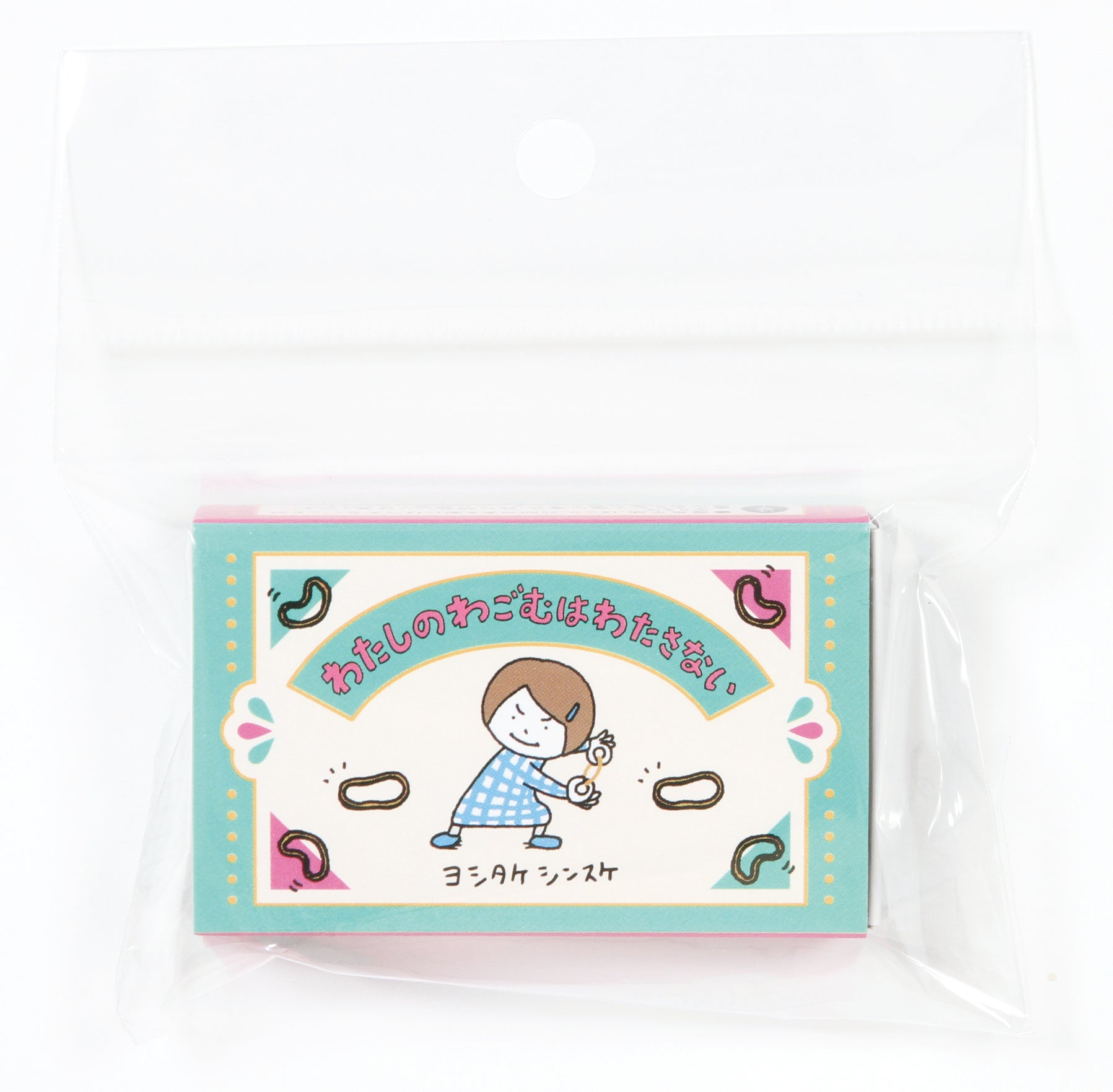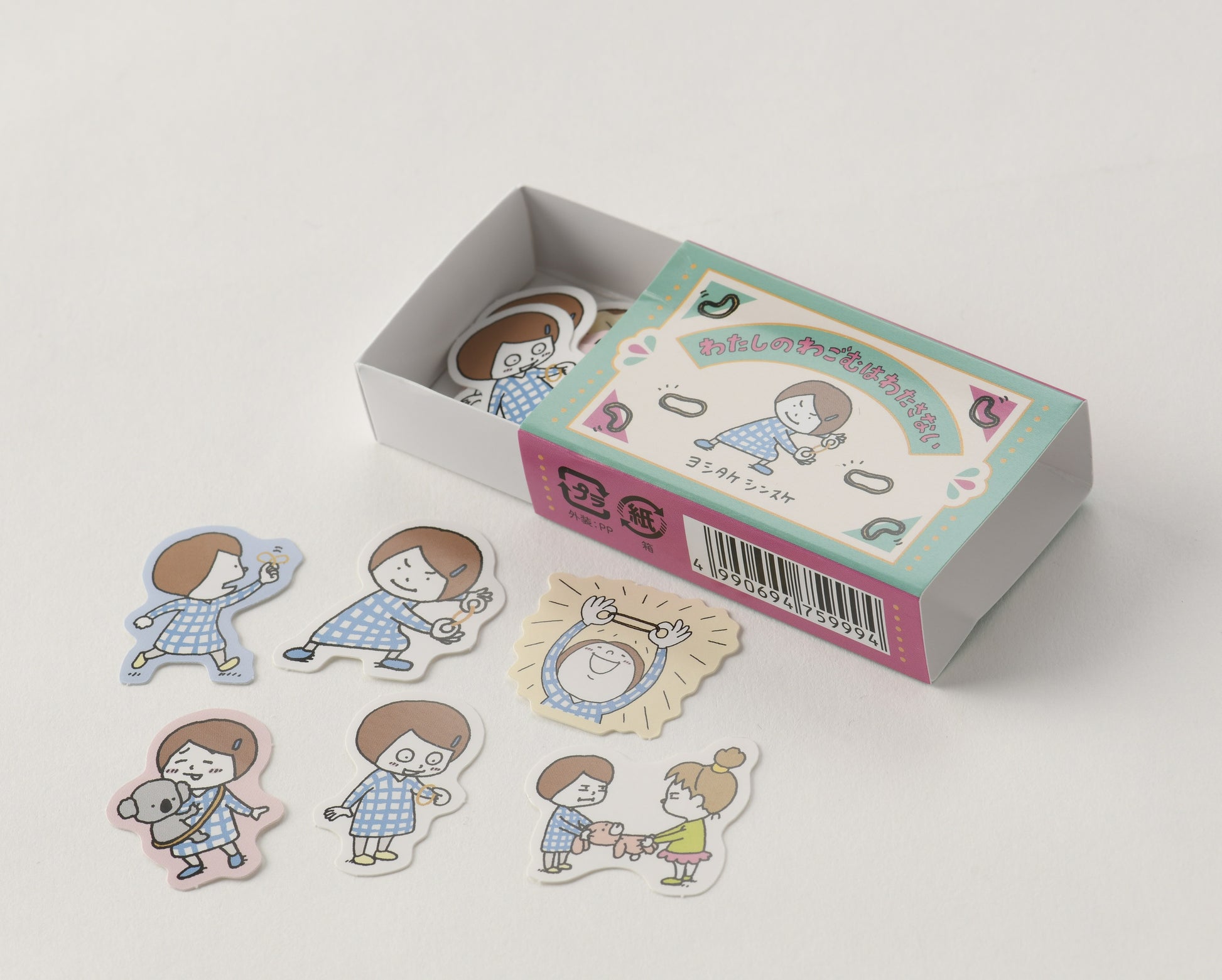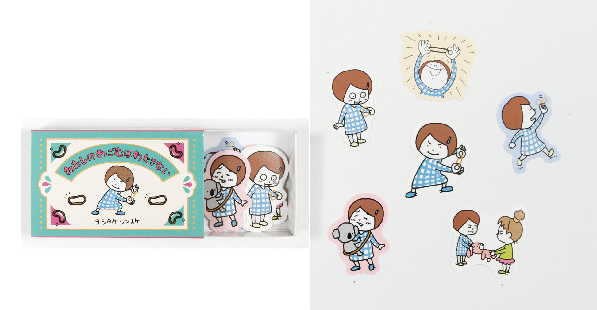 ■ヨシタケシンスケの人気絵本『わたしのわごむはわたさない』のフレークシールが、かわいいマッチ箱風ケースに入って登場。