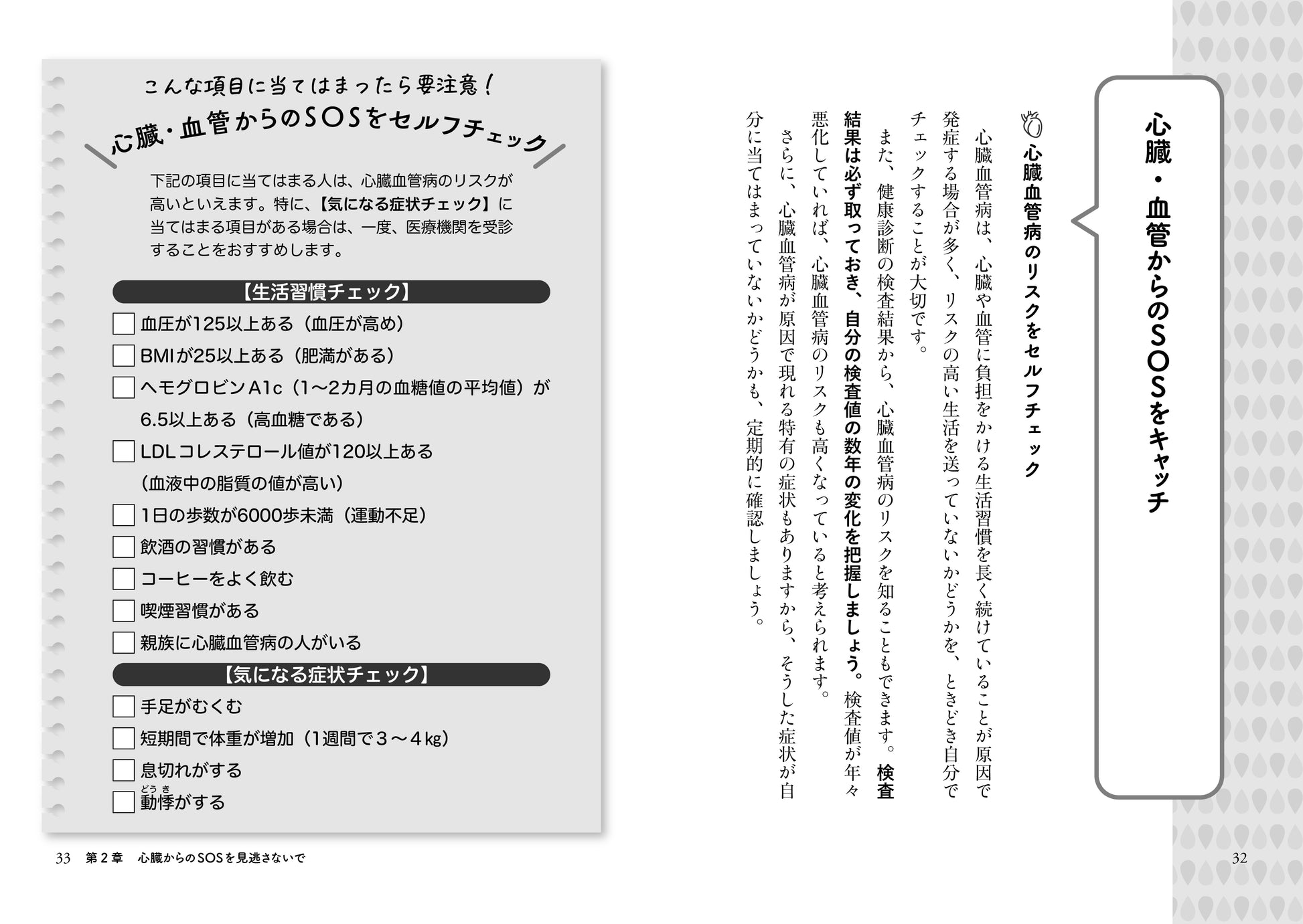 気づかぬうちに心臓や血管にダメージを与え、ある日突然、心不全や心筋梗塞に――。そうならないために、見逃してはいけない心臓・血管からのSOSと、心臓寿命を延ばす生活習慣を紹介。